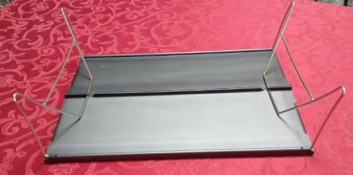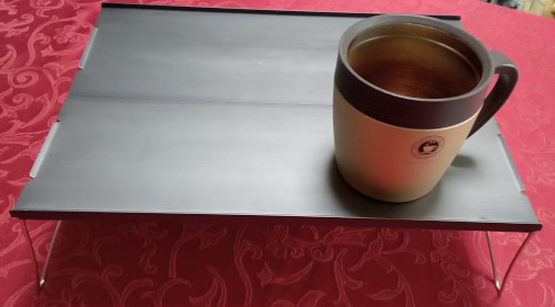 これは天板2枚を連結し、2セットの足パーツで摂津するタイプ。構造上2枚の天板が水平ではなく若干連結部分が少し凹む形になります。このため、このテーブルの上でガスバーナー等を使うのはお勧めしません。ヘリにでっぱりがあるので載せたコップやコッヘルが落ちることは有りません。とにかく安くコンパクトかつアルミでそこそこ熱にも強いので重宝しています。